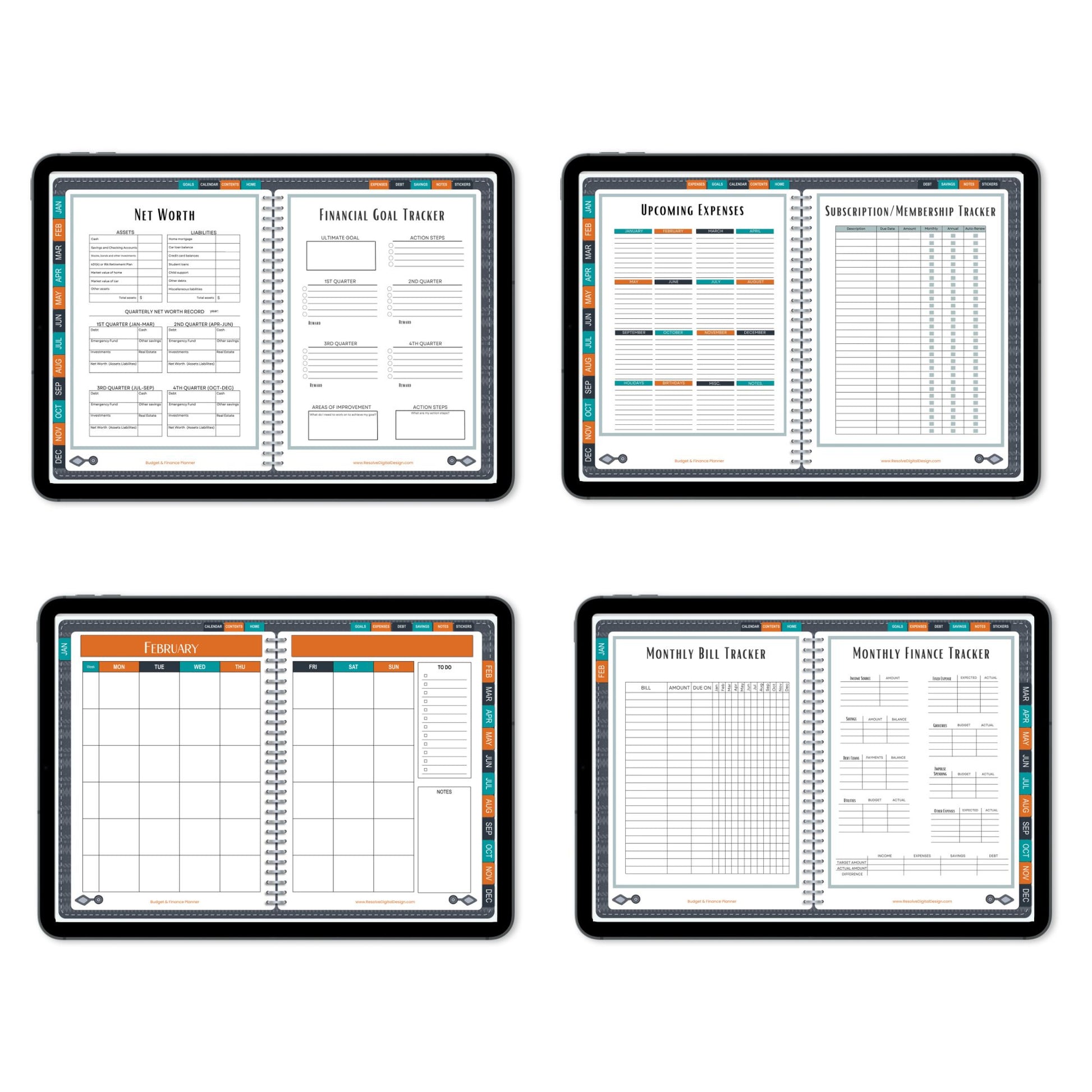 ✅ Each monthly section includes an undated 2 page spread calendar, a monthly bill trackers, a monthly finances tracker, and finances summary and goal reflection and review.