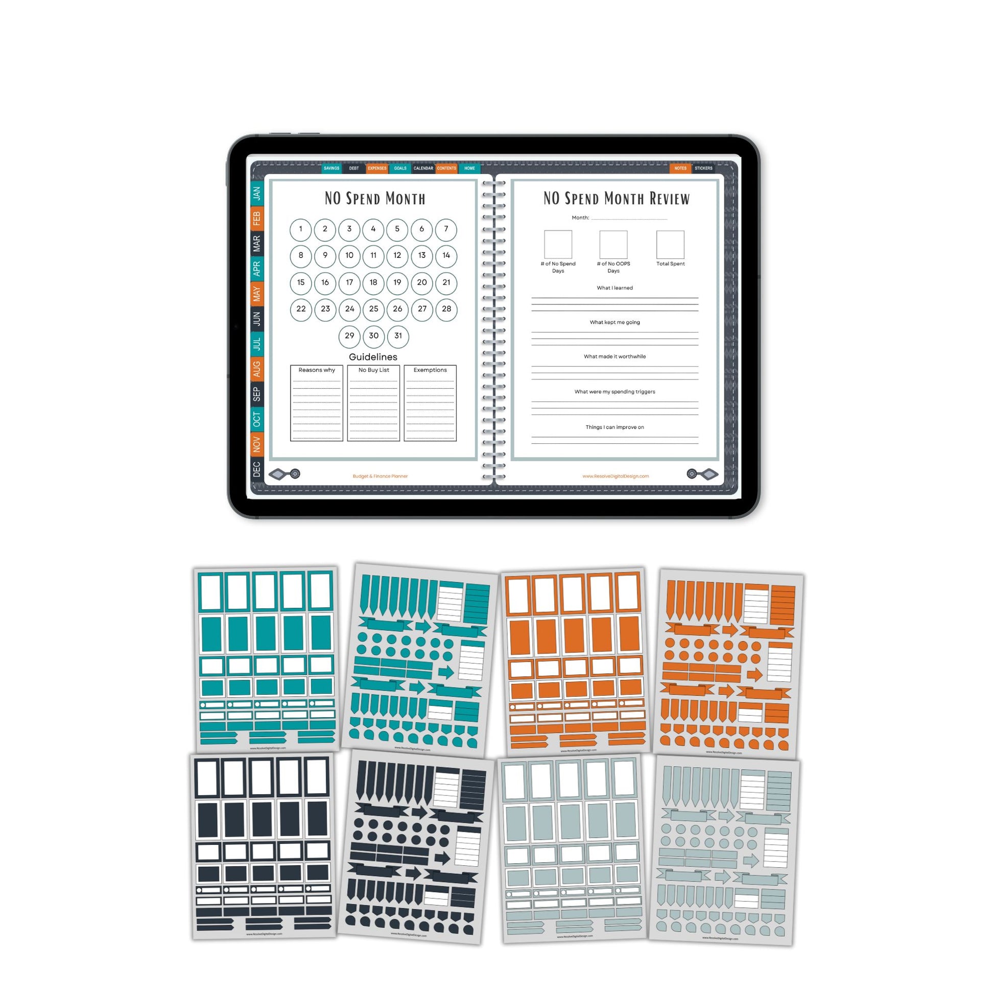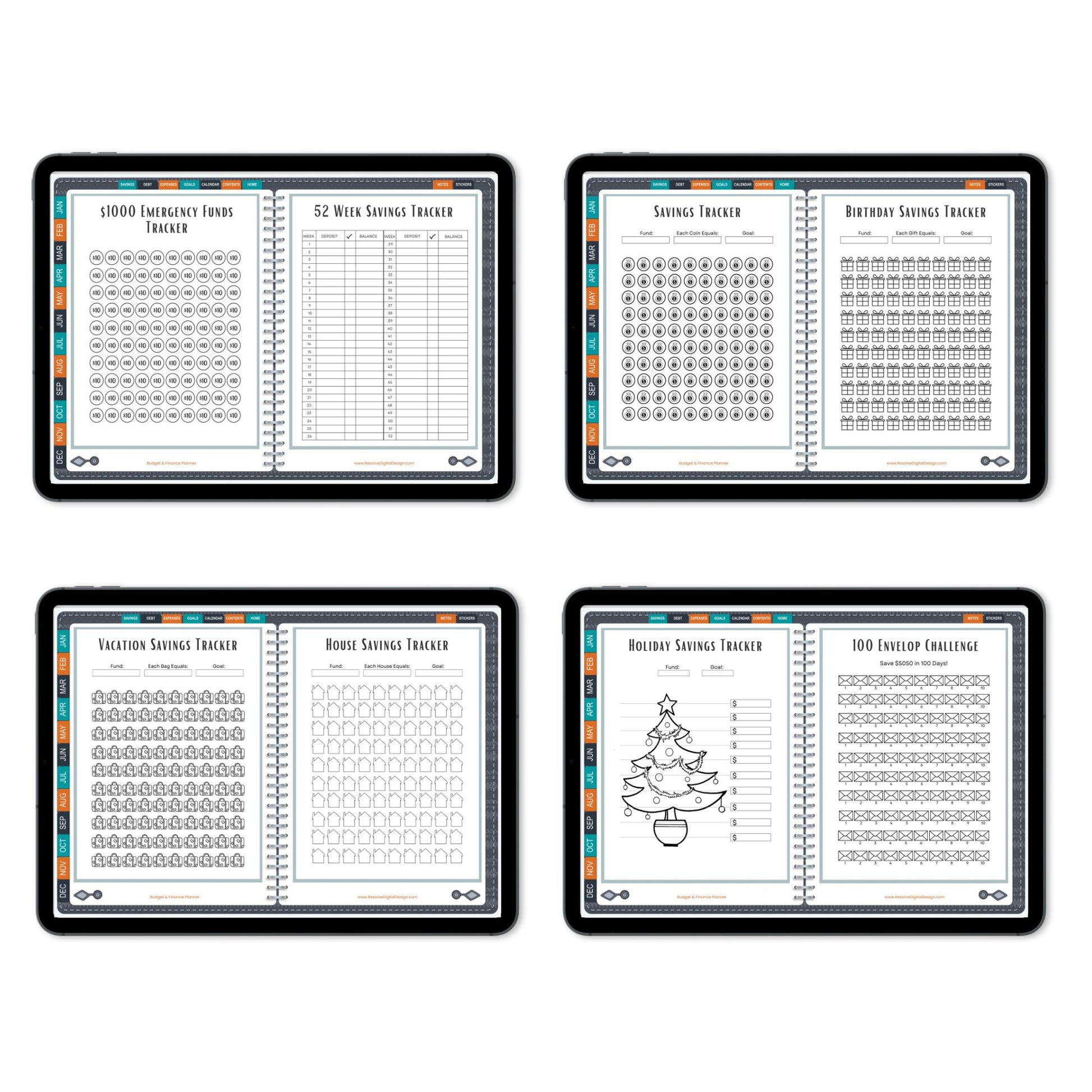 ✅ Savings goal jar, emergency savings fund, 52 week savings tracker, general savings tracker, birthday savings tracker, vacation savings tracker, holiday savings tracker, 100 envelop challenge, no spend month plan and review.