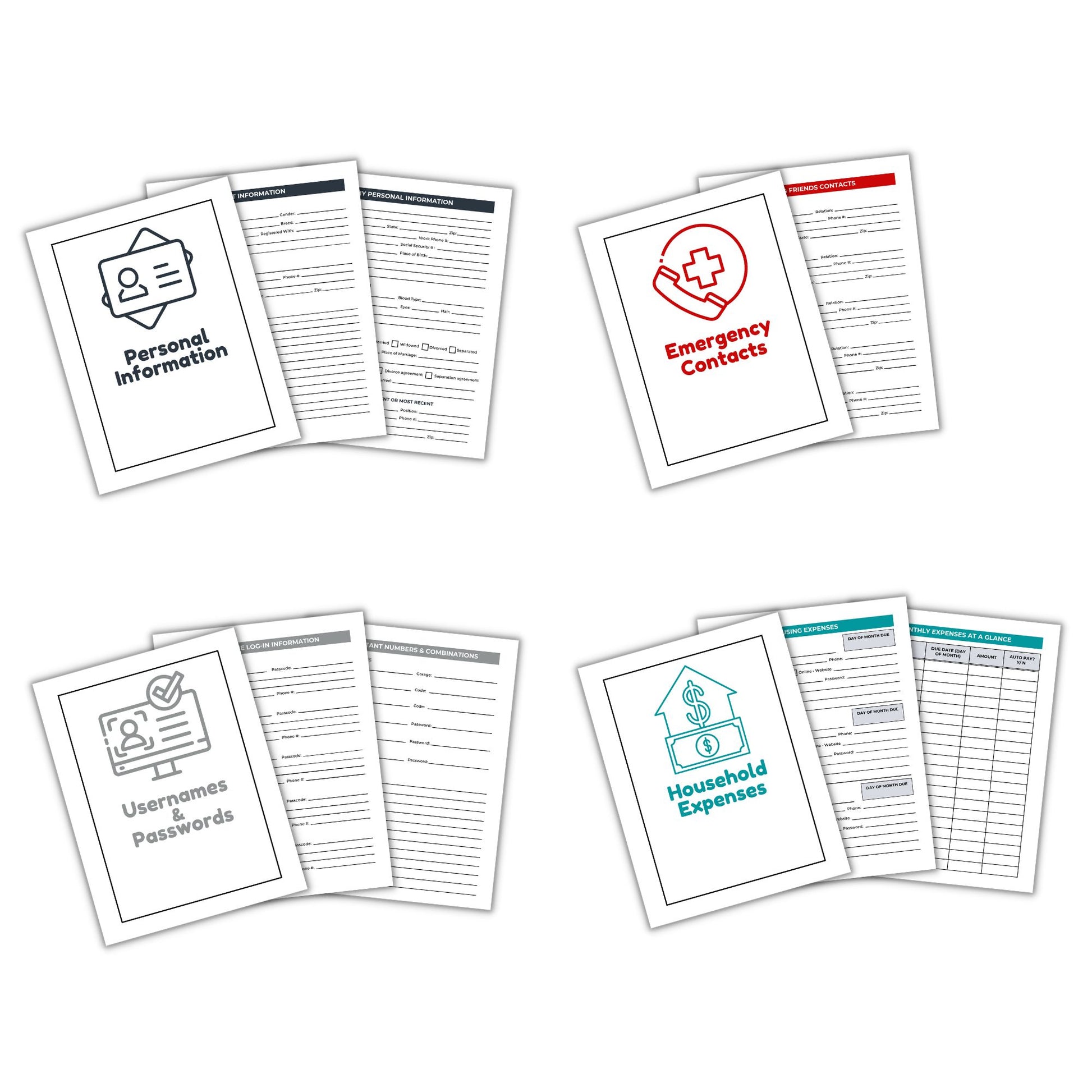✅ Usernames and passwords for cellphones, websites, social media accounts and security questions & answers along with home security, computer and other important numbers and codes.