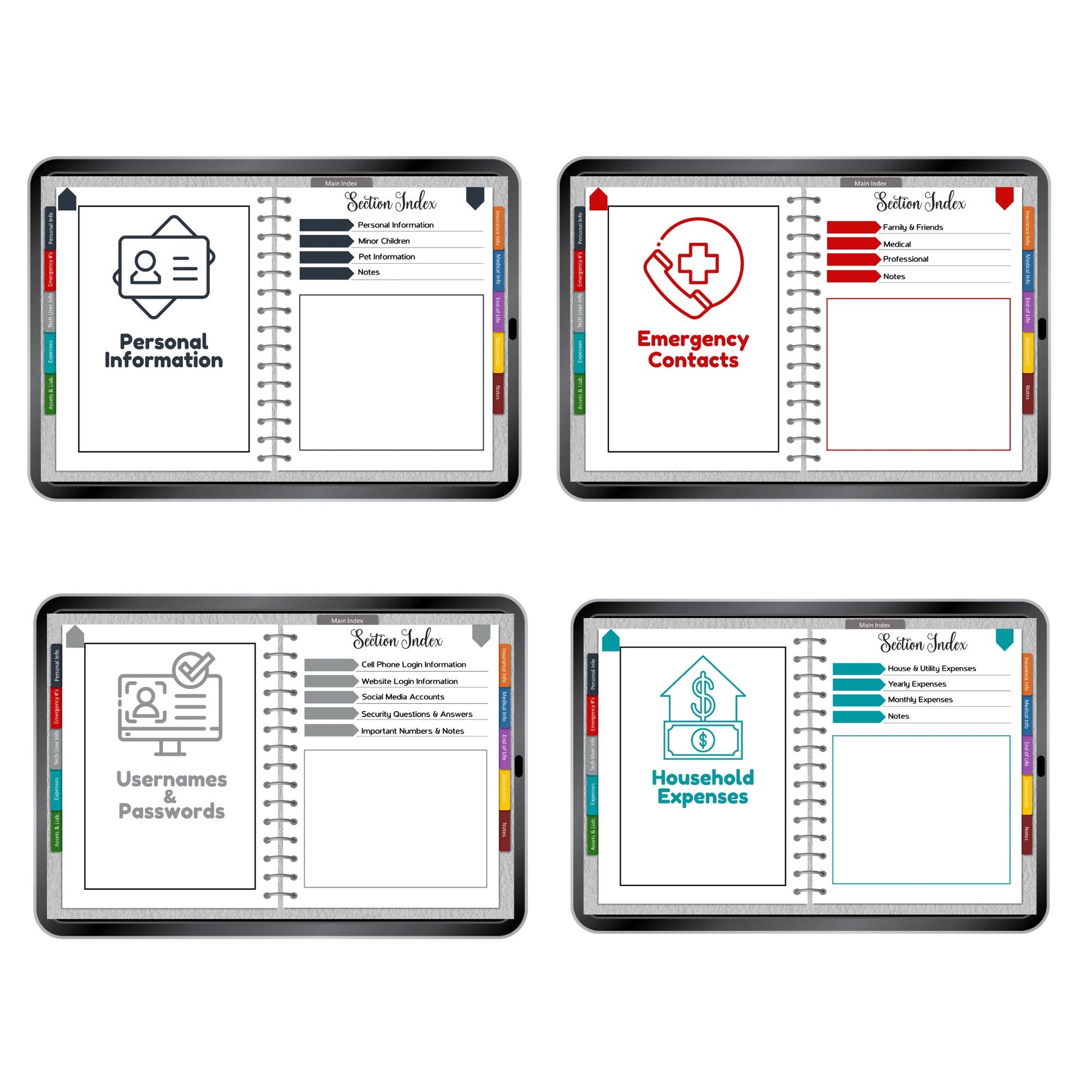 ✅ Usernames and passwords for cellphones, websites, social media accounts and security questions & answers along with home security, computer and other important numbers and codes.