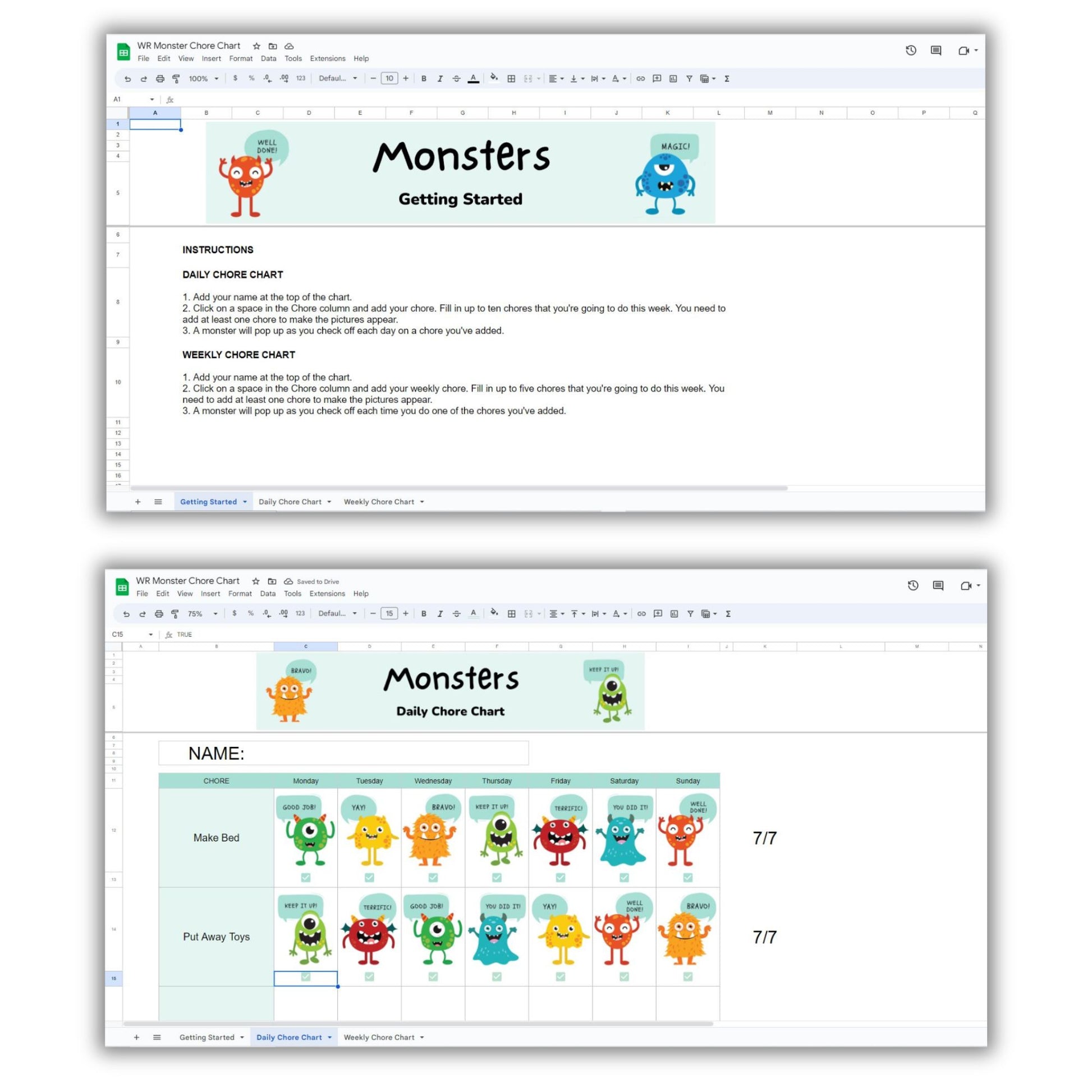 The Monster Chore Chart spreadsheet is a digital product you will be able to access instantly after purchase. It is designed to work and be used in the Google Sheets App.