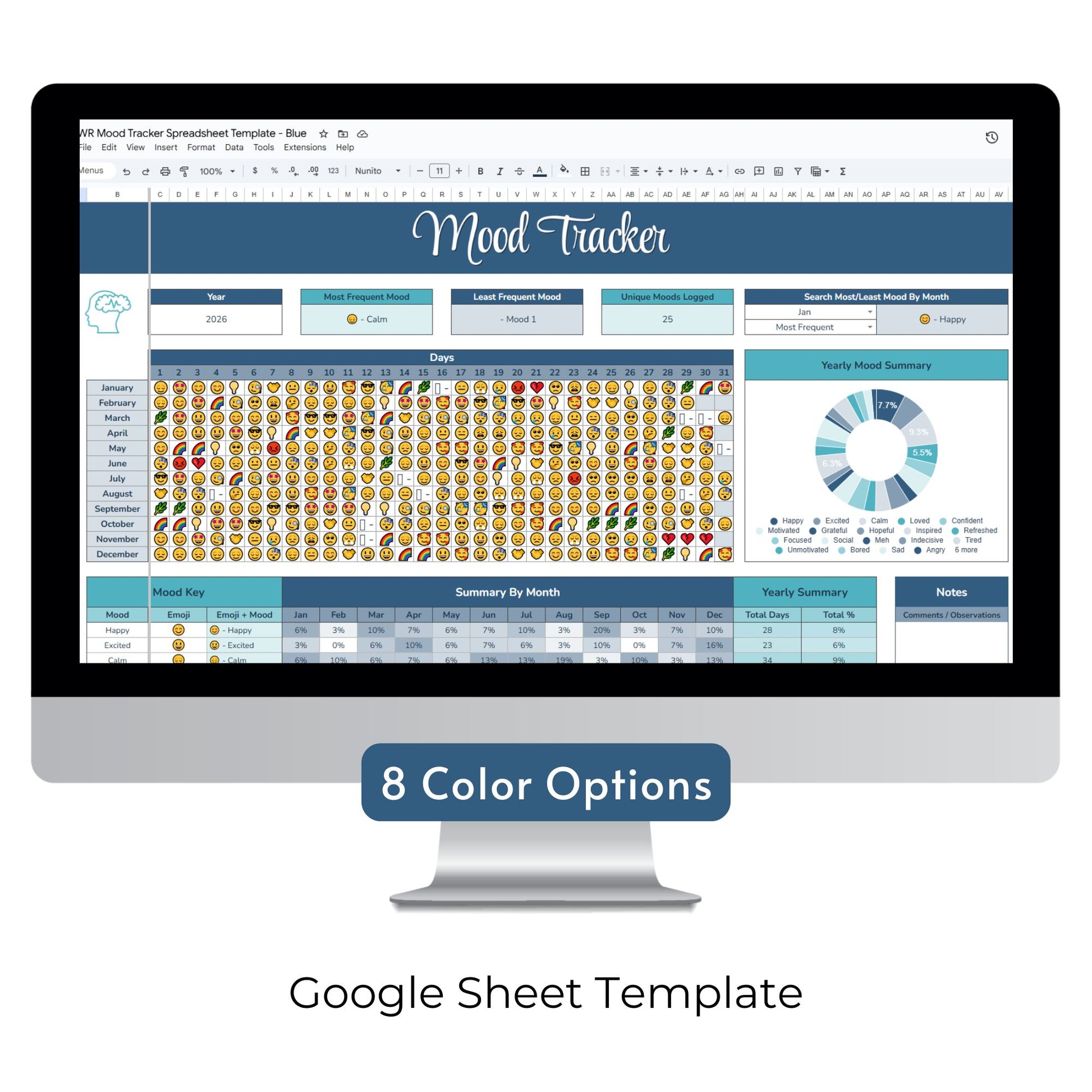 Make tracking enjoyable and personal! This Mood Tracker Spreadsheet Template comes in 8 vibrant color options to suit your style:
