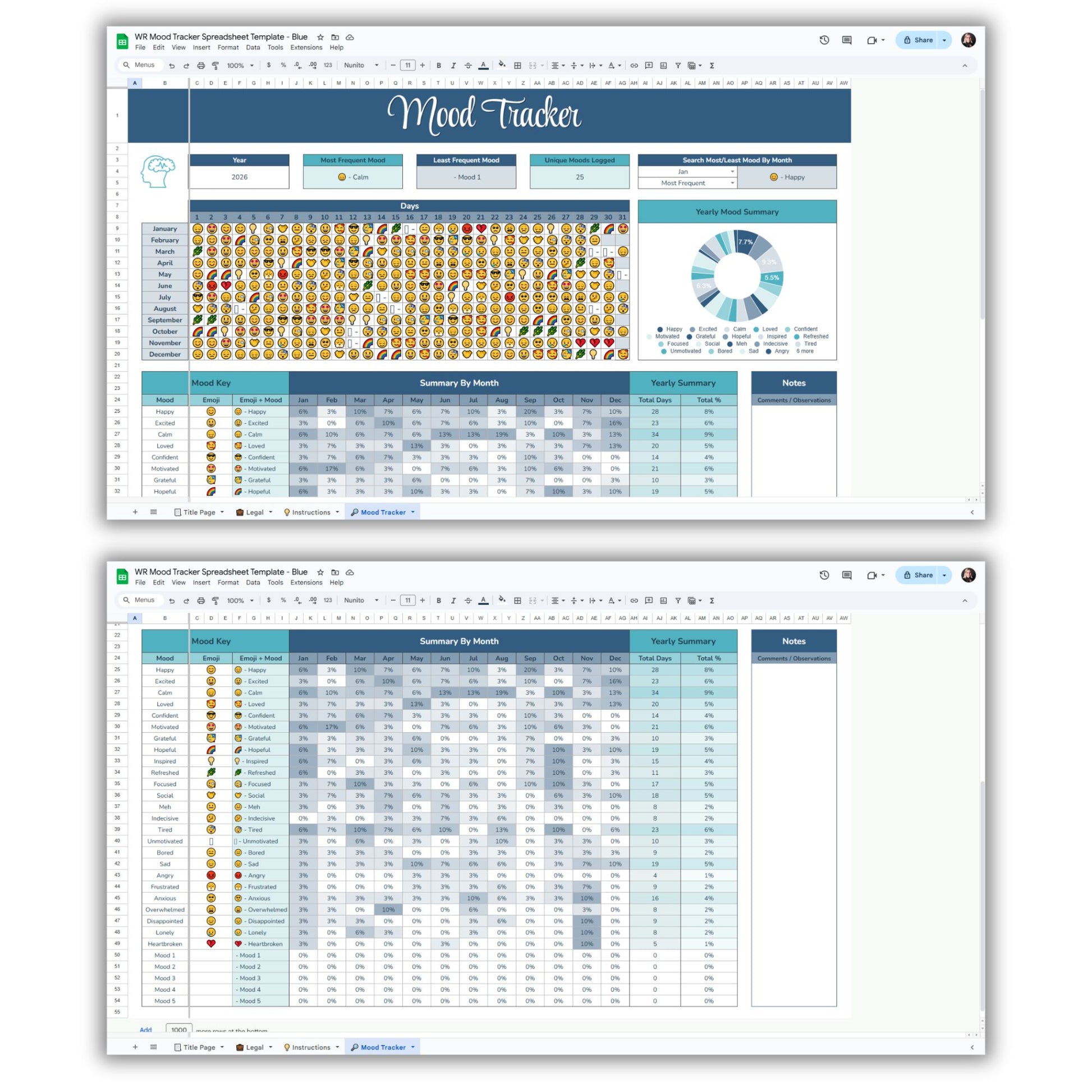 This compact, color-coded emoji mood tracker Google Sheet lets you see the full emotional spectrum of your year at a glance. It’s your personal mental health dashboard: clean, efficient, and (dare we say) kind of fun to use.