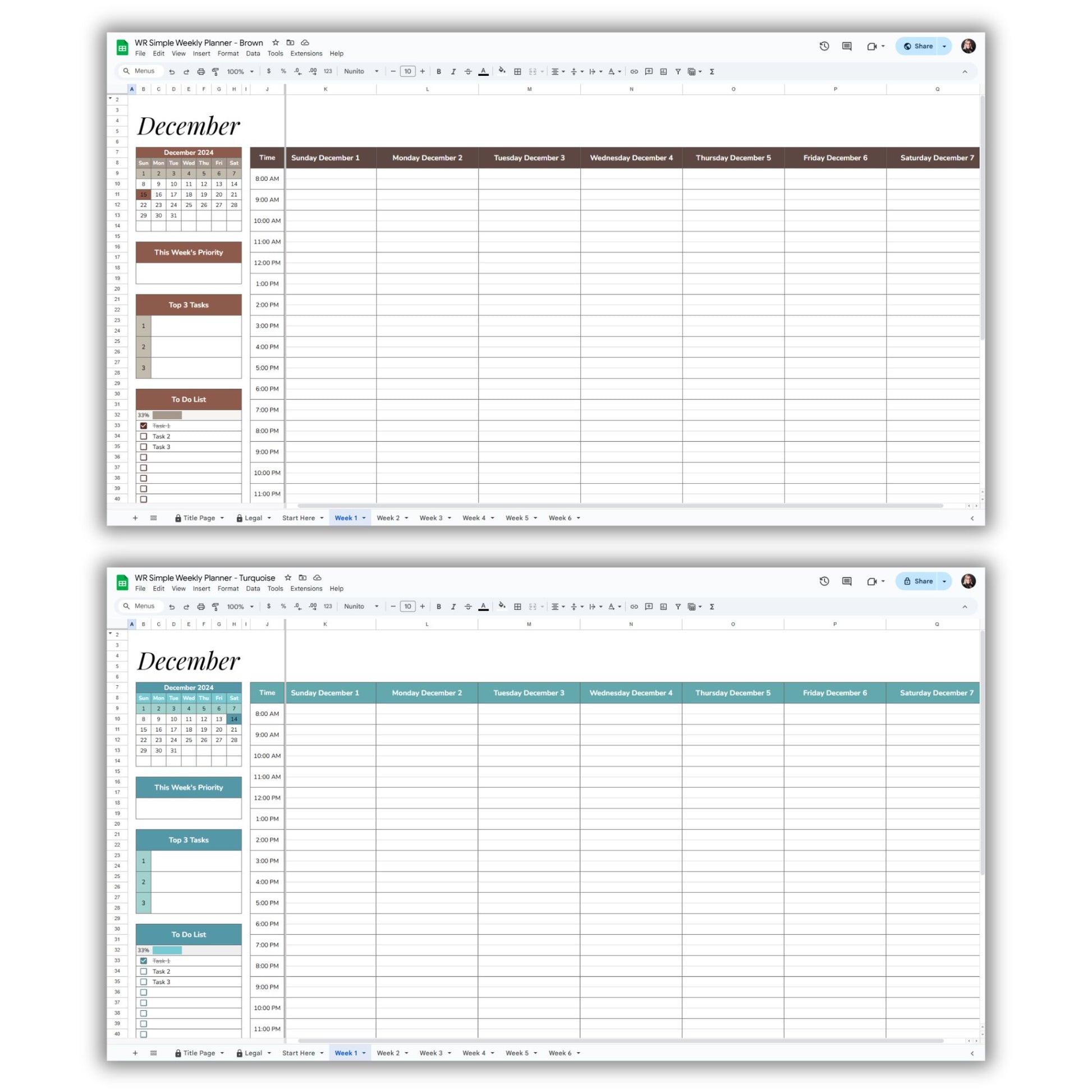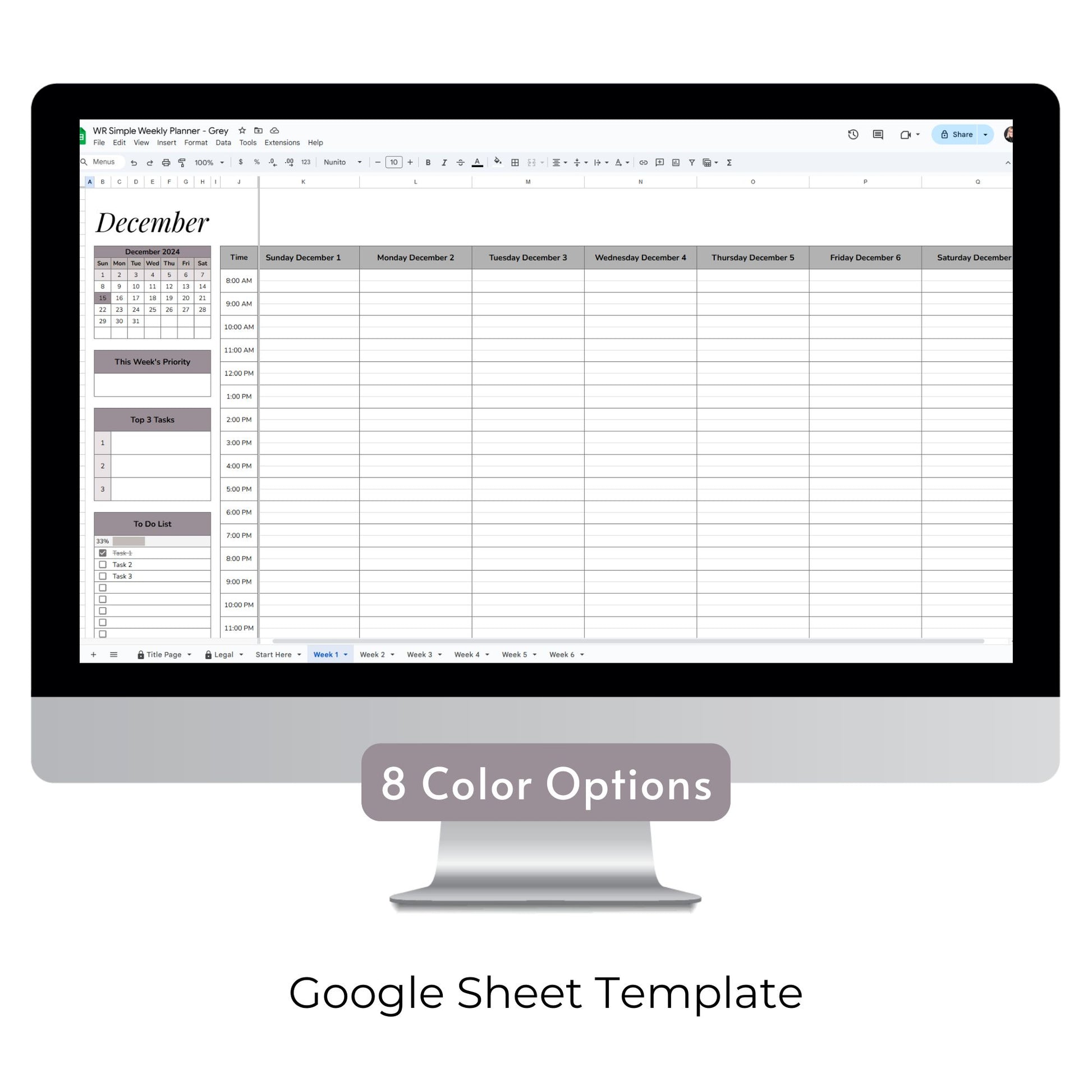 The Weekly Planner Spreadsheet Template comes in 8 vibrant color options to suit your style and preferences: